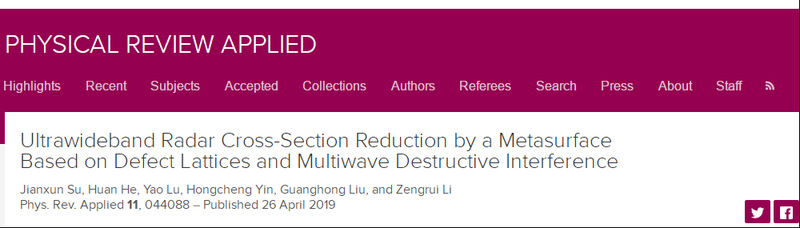 近日,物理类1区期刊《Physical Review Applied》刊登了公司2026世界杯官方合作网站教师在电磁隐身领域的重要研究成果“Ultrawideband Radar Cross-Section Reduction by a Metasurface Based on Defect Lattices and Multiwave Destructive Interference”。苏建勋副研究员为论文第一作者,李增瑞教授为通讯作者,公司为第一作者和通讯作者单位。该论文揭示了超宽频段内多种电磁波的相互作用机理,并提出二次相消干涉的新物理机制,首次实现10dB雷达散射截面缩减带宽超过4个倍频程,达到6.76个倍频程。