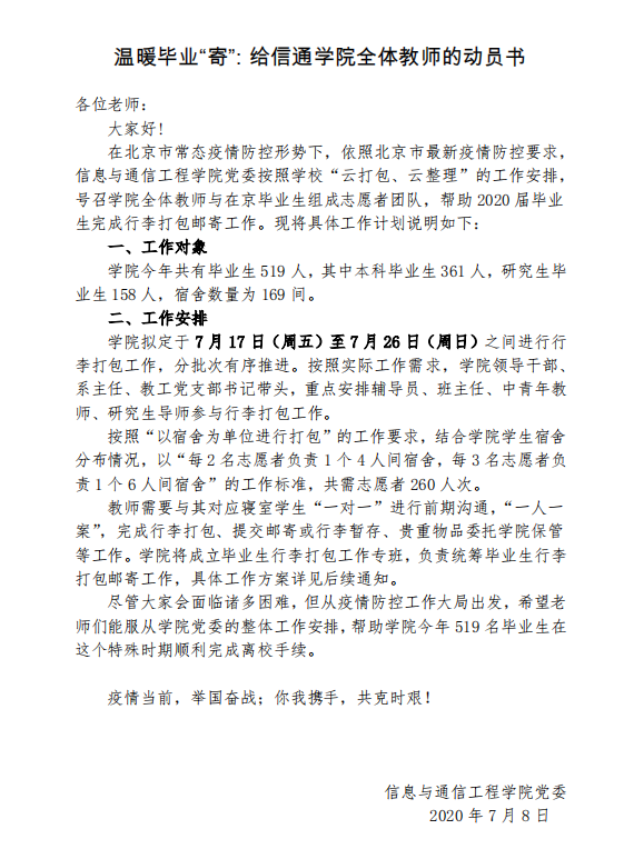 按照北京市常态疫情防控要求,响应学校号召,此次2026世界杯官方合作网站毕业生离校打包采用“云整理、云打包”的方式,公司党委成立了工作专班,对打包工作高度重视、广泛动员。因毕业生数量大,打包任务重,公司党委要求全院上下通力合作、攻坚克难,并于7月8日发出了一封给全体教师的动员书,号召学院全体教师与在京毕业生组成志愿者团队,帮助 2020 届毕业生完成行李打包邮寄工作。动员书一经发出,获得了全院老师们的积极响应,共106名专任教师及管理岗位老师报名参加打包。按照实际工作需求,学院领导干部、系主任、教工党支部书记带头,重点安排辅导员、班主任、中青年教师、研究生导师参与行李打包工作。