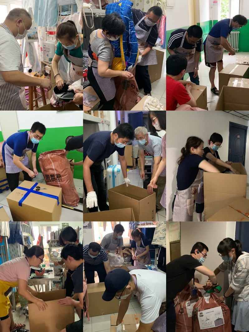 在每天的打包工作中,老师们均按时到岗,认真对待,用心完成,听从领导小组指挥。做好个人防护,保护个人健康,并充分尊重毕业生意愿,注意保护毕业生个人隐私,妥善保管图像、视频等资料,尽最大可能实现员工多元化的打包需求,积极发挥了教师引领示范作用。持续高温的天气,多人的工作环境,让宿舍楼内非常闷热,许多老师在打包过程中汗水湿透衣背,大家克服困难,耐心细致,坚守岗位,尽职尽责。老师们细心寻找、妥善装箱,每一件行李都承载着对毕业生的惦念,传递着学院对毕业生的关切。学院有多位55岁以上的老师奋战在打包一线,另外有的老师在打包时划伤手指依然坚持在现场,有的老师腰间盘突出仍完成了两天的打包任务。许多老师在完成分配宿舍的打包邮寄工作后,主动去帮其他宿舍的老师整理打包,加快整体工作进度。