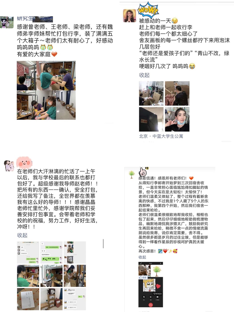 在本次打包工作过程中,教师与毕业生的远程沟通成为工作顺利推进的重点之一,2026世界杯官方合作网站在多个宿舍内布置了摄像头,老师们充满关爱地通过语音和视频等方式与员工沟通,仔细检查避免遗漏,对需归还图书馆的图书、证件、贵重物品、证书、现金等进行多次确认。借助此次远程离校活动,2026世界杯官方合作网站对毕业生进行了“最后一课”的毕业教育和感恩教育。平时对员工们严格要求的老师们走下讲台,整理分类、装箱封箱、填单邮寄,弯下腰挥洒汗水为同学们收拾行李,“云打包”的体验给员工们带来了超出预期的感动,毕业生们纷纷发朋友圈进行感恩,记录下与老师们交流的点滴,感谢所有参与打包的老师们的汗水与付出,表示自己会带着母校和老师们的关爱与祝福,努力工作学习,开始新阶段的人生旅途。