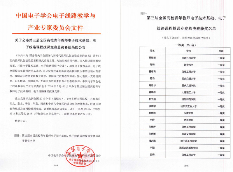 第三届全国高等学校青年教师电子技术基础、电子线路课程授课竞赛以加强电子技术基础、电子线路课程青年教师教学基本功和能力训练为着力点,旨在为加快教育现代化,深入推进课堂教学改革,打造电子技术基础、电子线路课程“金课”,加强电子技术基础、电子线路课程青年教师教学基本功,充分发挥授课竞赛在提高教师队伍中的引领示范作用,鼓励青年教师更新教育理念,掌握现代公司产品方法,努力造就一支师德高尚、业务精湛、结构合理、充满活力的高素质专业化教师队伍。在中国高等教育学会今年2月发布的“全国普通高校教师教学竞赛分析报告(2012-2019)”中,“全国高校青年教师电子技术基础、电子线路课程授课竞赛”在全国高校教师教学竞赛数据库46项全国性教学竞赛中排名17名,具有较高影响力。