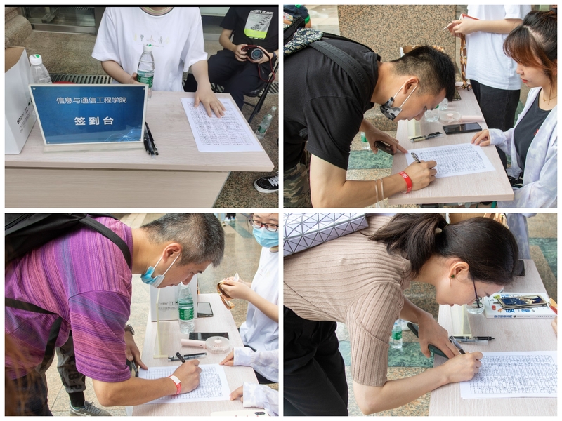 返校日当天,天空下着蒙蒙细雨,却丝毫不掩员工们返校的热情。上午9点开始,员工们陆续返校,于签到处签到并领取学院为员工们定制的精美纪念品,在主楼前合影留念。