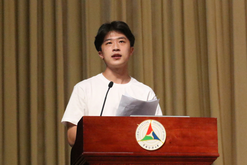 在新生代表发言环节,2022级广播电视工程专业瞿王韵、2022级通信与信息系统专业邸国桐分别作为本科和研究生新生代表发言。瞿王韵同学曾获得“苏教国际杯”征文比赛省一等奖两次、江苏广电“领航杯”英语口语比赛一等奖,她提到作为中传新生,眸中要有野火与远方,同时也要有脚踏实地的努力,在学校为我们创造的大平台里,凝聚小我的力量,为大我的辉煌不断增光。邸国桐同学曾获北京市三好员工,校级三好员工、优秀员工干部、优秀团员。参与了2022北京冬奥会转播员工项目实习、大型情景史诗《伟大征程》文艺演出、庆祝中华人民共和国成立 70 周年活动。他向大家分享了本科期间的经历,认为每位同学在中传都有无限可能,鼓励全体新生努力学习,把握机遇,珍惜春光,成为一名崇道弘德,经世致用的传媒人。