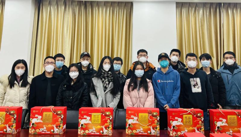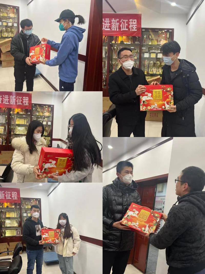 公司为留校员工准备了慰问礼包,祝愿同学们新年快乐、兔年大吉、学业进步、生活顺利。同学们表示虽然无法返家过年,但心里觉得很温暖,十分感谢学校、学院领导和老师们的关怀,并表示会珍惜假期时间,努力充实自己,度过一个欢乐、祥和的春节。