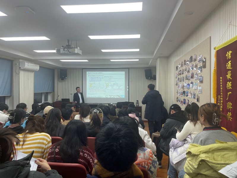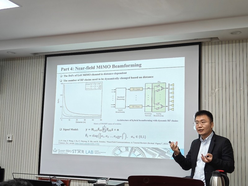 此次报告的主题是“近场通信:有什么不同?”,主要对无线通信领域的前沿知识进行了介绍。刘元玮副教授从信道建模,性能分析,波束赋形以及通信应用这四个方面出发,以生动的语言深入浅出地阐述了近场通信与远场通信之间的差异。报告首先介绍了均匀球面波和均匀平面波这两种模型,从信道建模的角度讨论了近场和远场信道模型的差异。随后,刘元玮副教授介绍了近场通信的自由度和功率缩放率的性能分析结果,并对近场通信中波束赋形设计和天线架构进行讨论,比较了远场波束控制和近场波束聚焦的特点。最后,刘元玮副教授介绍了近场通信技术丰富的应用场景,以及其在未来研究中潜在的机遇和挑战。报告结束后,参会师生结合各自科研领域就报告内容进行讨论与提问,刘元玮副教授对这些问题一一进行了解答,并与老师和同学们展开了深入的交流。