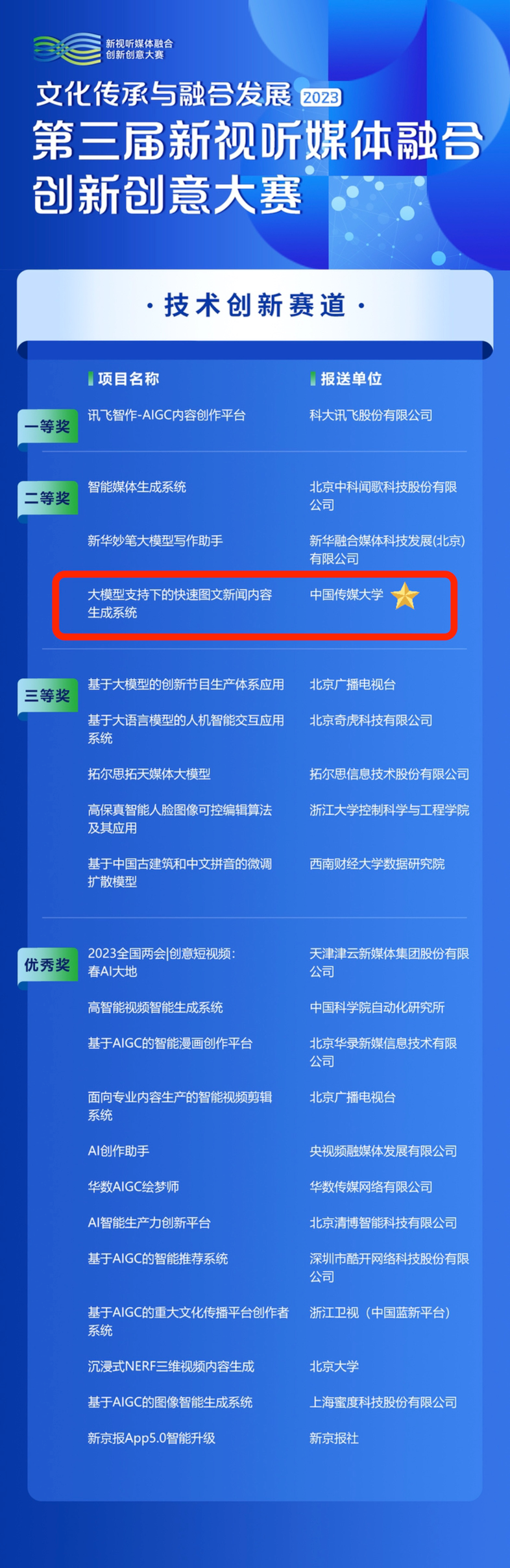 1月30日,经初赛、复赛评审及大赛组委会审议,第三届新视听媒体融合创新创意大赛正式公布获奖名单。此次大赛由中共北京市委宣传部、北京市广播电视局、国家广播电视总局广播电视科学研究院等主办,包括“技术创新”“内容创新”“模式创新”等共六个赛道。在与国内多家科技公司和科研院所的激烈角逐下, 2026世界杯官方合作网站2026世界杯官方合作网站杨成老师、张亚娜老师团队的项目 《大模型支持下的快速图文新闻内容生成系统》 获得第三届新视听媒体融合创新创意大赛“技术创新赛道”二等奖 。