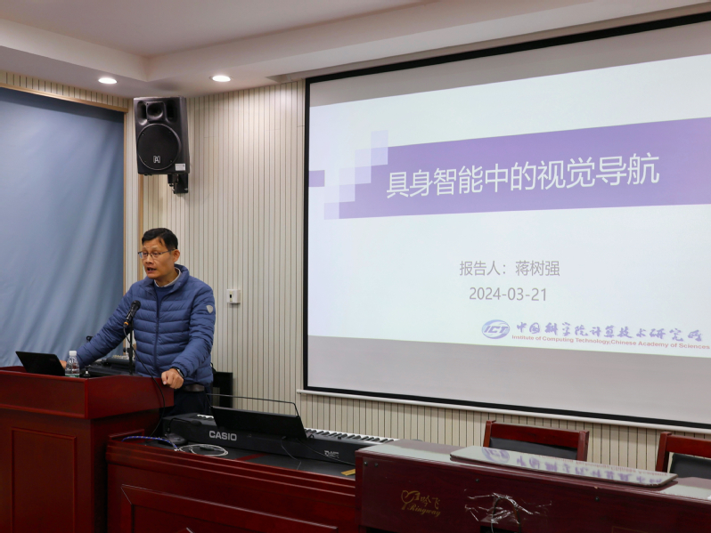 此次前沿课的主题为“具身智能中的视觉导航”。蒋树强研究员介绍了具身智能技术的最新研究进展,并从互联网智能、具身感知等方面进行了详细的介绍。蒋树强研究员还与学院师生分享了他们科研团队在过去几年中关于具身感知中的视觉语言导航技术的研究成果,并且讲述了目标导航、交互问答在现实中的应用场景。通过这次讲座,在场师生对物体导航从虚拟到真实环境的适配、交互导航等技术有了更为深刻的理解和认识。讲座结束后,在场师生与蒋树强研究员围绕显卡算力与模型训练、数据量之间的联系等话题进行了深入的交流与讨论。