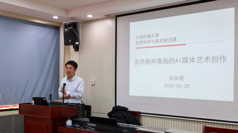 此次前沿课的主题为“多风格肖像画的AI媒体艺术创作”。刘永进教授介绍了人脸图像分析与生成的最新研究进展,并从几何建模、真实感与非真实感绘制、动画仿真等方面进行了详细的介绍。刘永进教授还与学院师生分享了他们科研团队在过去几年中关于图像风格化的研究成果,并且讲述了肖像画生成技术在现实中的应用场景。通过这次讲座,在场师生对计算机图形学、视觉艺术表达等技术有了更为深刻的理解和认识。讲座结束后,在场师生与刘永进教授围绕大模型生成的图像是否具备艺术性等话题进行了深入的交流与讨论。