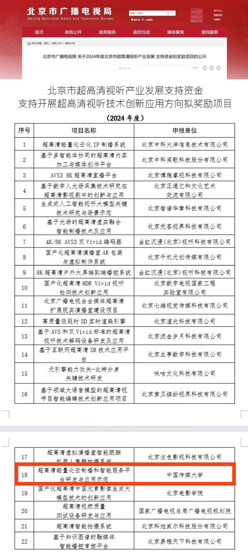 据悉,北京市超高清视听产业发展支持资金奖励项目旨在培育壮大新质生产力,全面推进北京市超高清视听全产业链优化升级,本次评选经材料初审、技术评测、现场评测、专业评测、查重比对和综合评审,最终7个方向共159个项目入选,其中超高清视听技术创新应用方向22个项目入选。