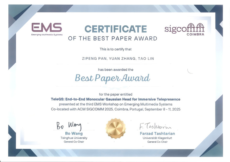近日, 由公司张远教授、林涛研究员指导,2024级信息与通信工程专业博士研究生潘子芃在计算机网络领域国际顶级会议SIGCOMM 2025主办的Emerging Multimedia Systems(EMS) Workshop上发表的论文《TeleGS: End-to-End Monocular Gaussian Head for Immersive Telepresence》荣获本届唯一的最佳论文奖。